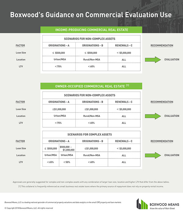 Of course, commercial banks can devise a myriad number of ways to employ evaluations within their appraisal policies that keep safety and soundness uppermost among the banks' priorities. With 100+ years of collective institutional and private appraisal experience among Boxwood's staff, we believe the above guidance is a great place to start for any commercial bank that may be contemplating changes in use of commercial evaluations under the new de minimus level, or expanding use to enhance current operations.
