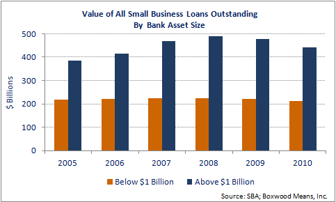 The bigger banks reduced all small business loans during the recession and through the latest reporting period. The value of small business loans outstanding among banks with assets of $1 billion or more collectively dropped 7.1% last year, accounting for $34.1 billion, or nearly 80% of the change in loan value since the previous year. More than $18 billion of last year's reductions were completed by megabanks with $50 billion or more in assets.