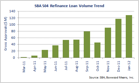Indeed, gross approval dollars for the 504 refi program jumped 100% from $45.4 million (via 58 transactions) in October to $91.0 million (91 transactions) in November; and has continued rising to $128.6 million (143) in January.