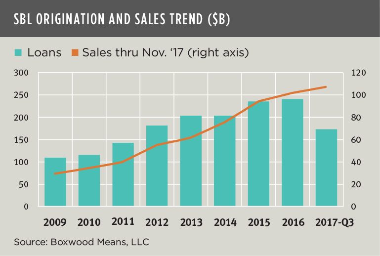 In fact, you can see in the nearby graph how transaction sales and SBL originations have increased in lockstep over time. SBL volume hit a post-crisis high at $240.2 billion during 2016 as purchase loans contributed nearly 42% of total volume, representing the highest percentage in at least eight years. SBL volume for 2017 will surpass $200 billion for the fifth consecutive year but will likely fall short of the previous record based on totals through the first three quarters.