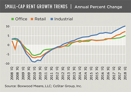 Equally remarkable - and the proximate cause for the unprecedented rent growth - are prevailing small-cap vacancy rates. At a figure chained below 5% for the seventh quarter in a row, the aggregate national vacancy rate of 4.4% is seemingly suspended in time at record-low levels. All three main property types have achieved record low vacancies: Industrial at 3.4% and perched 260 bps below the previous cyclical low; Retail at 4.3% and comfortably 150 bps beneath its previous nadir; and Office, at 6.7%, unchanged for four quarters and 140 bps below its former low before the Great Recession.